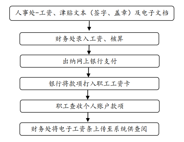 1. 每月1日前,人事处、学生处、后勤等部门把工资变动通知单及各类津补贴发放表电子版和纸质版提交财务处。